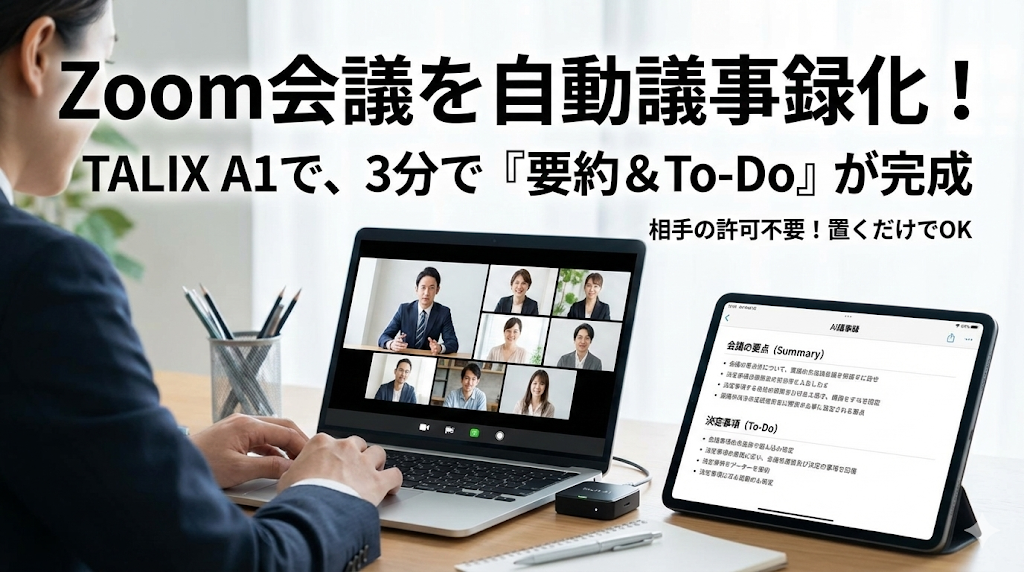 この記事では、相手に気を使わず、自分の手元だけで完結する**「DingTalk TALIX A1を使ったZoom議事録化」**の手順を解説します。準備は一瞬、議事録生成は会議後3分で完了します。
