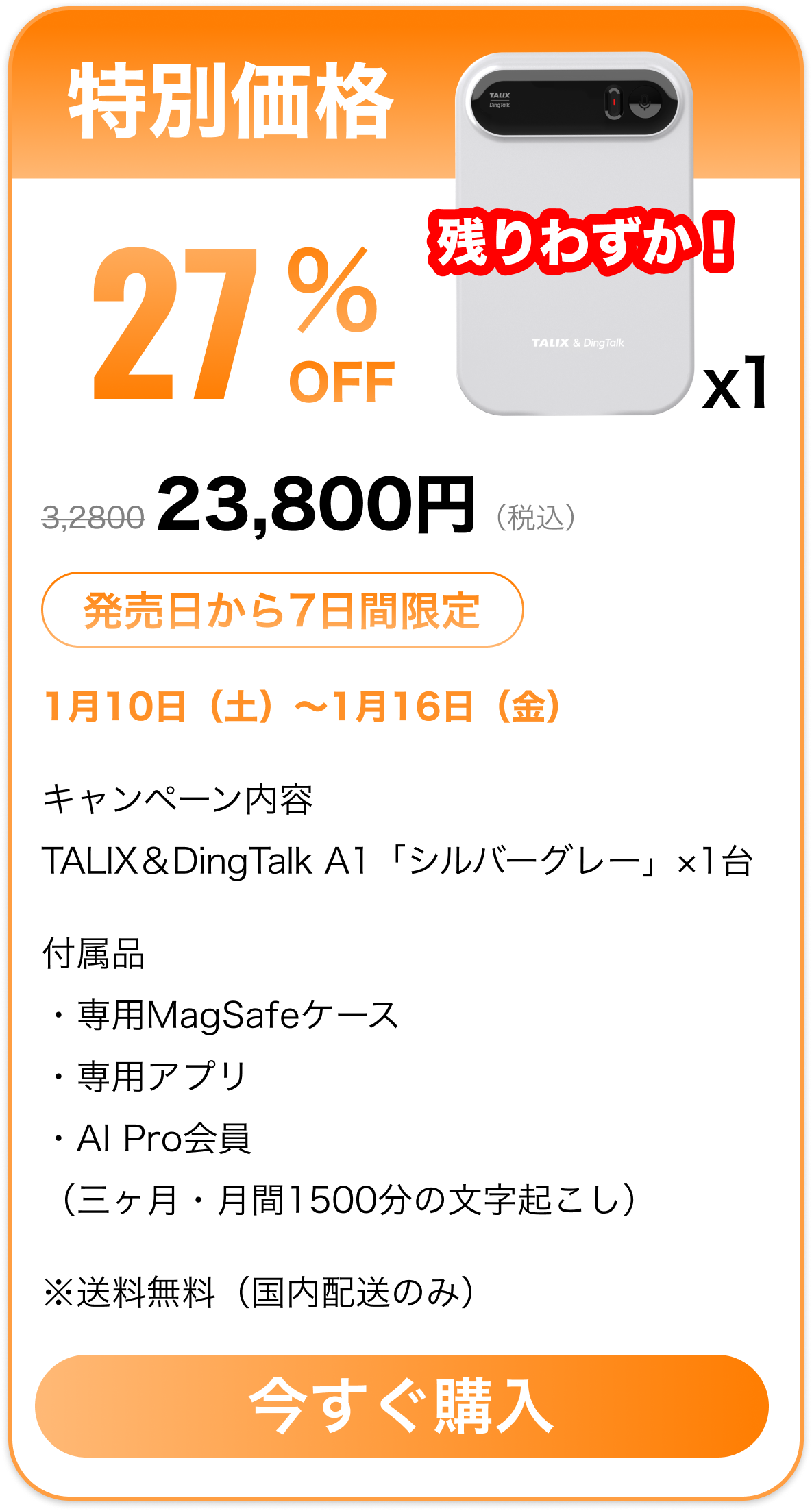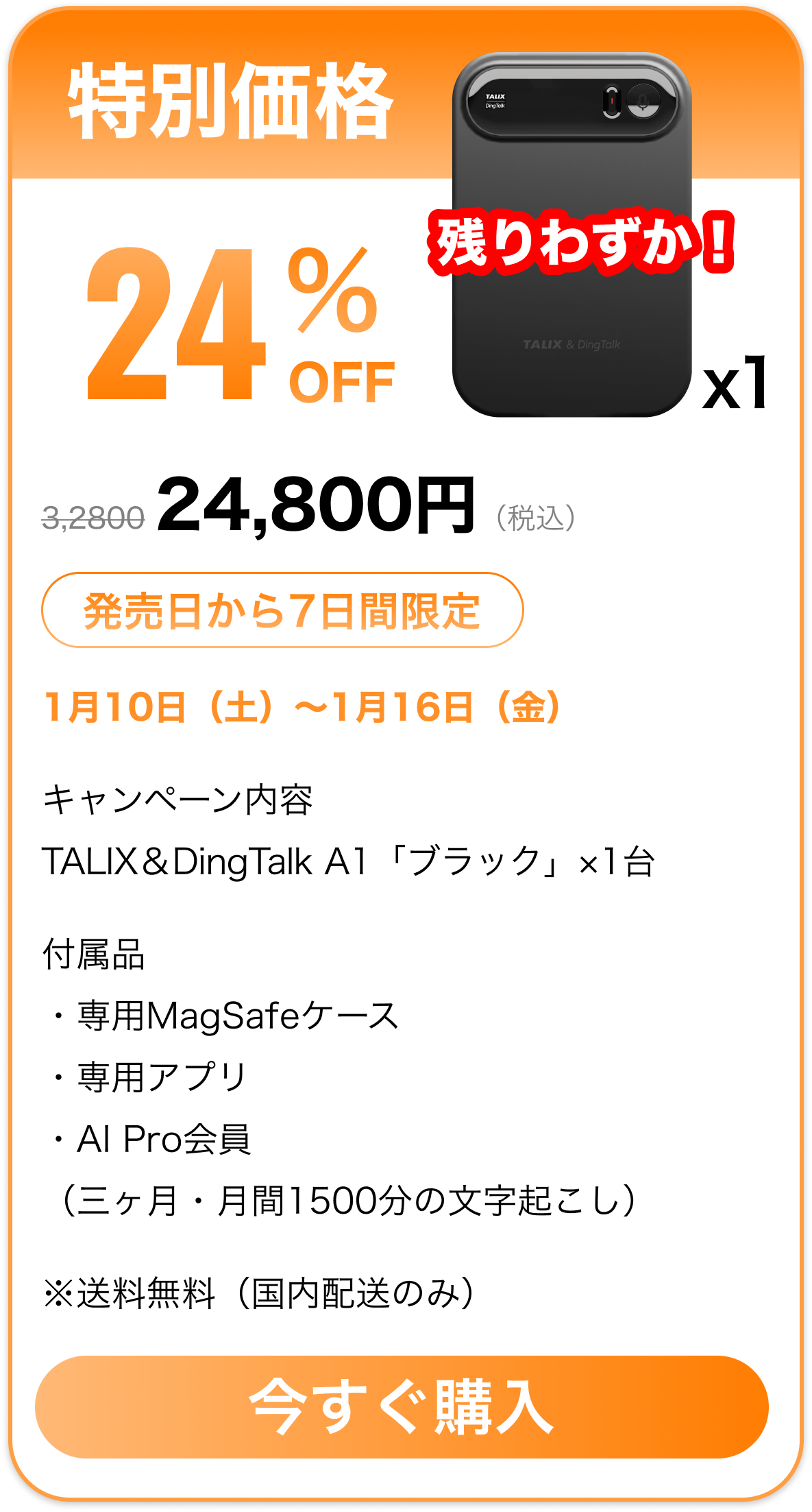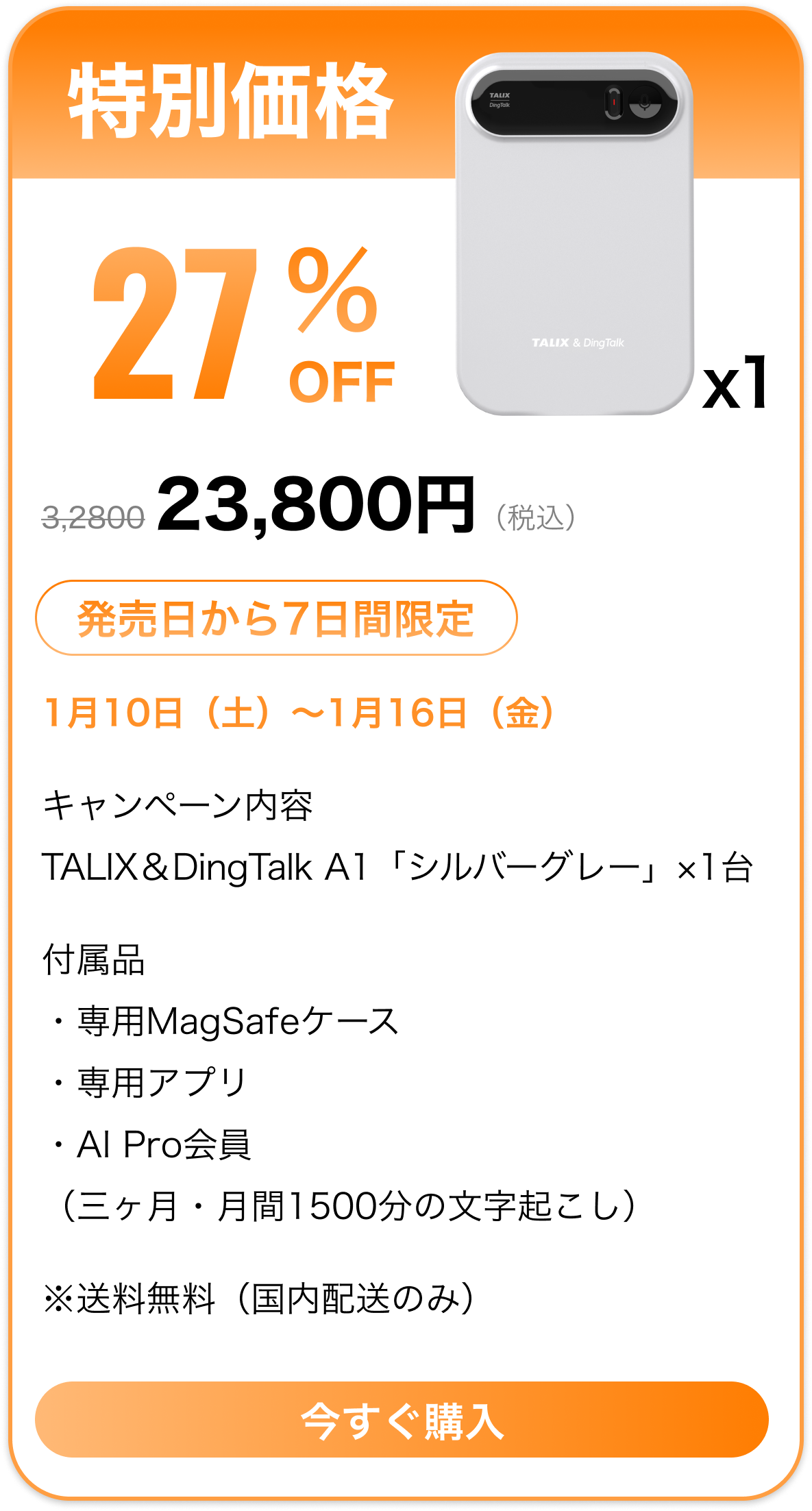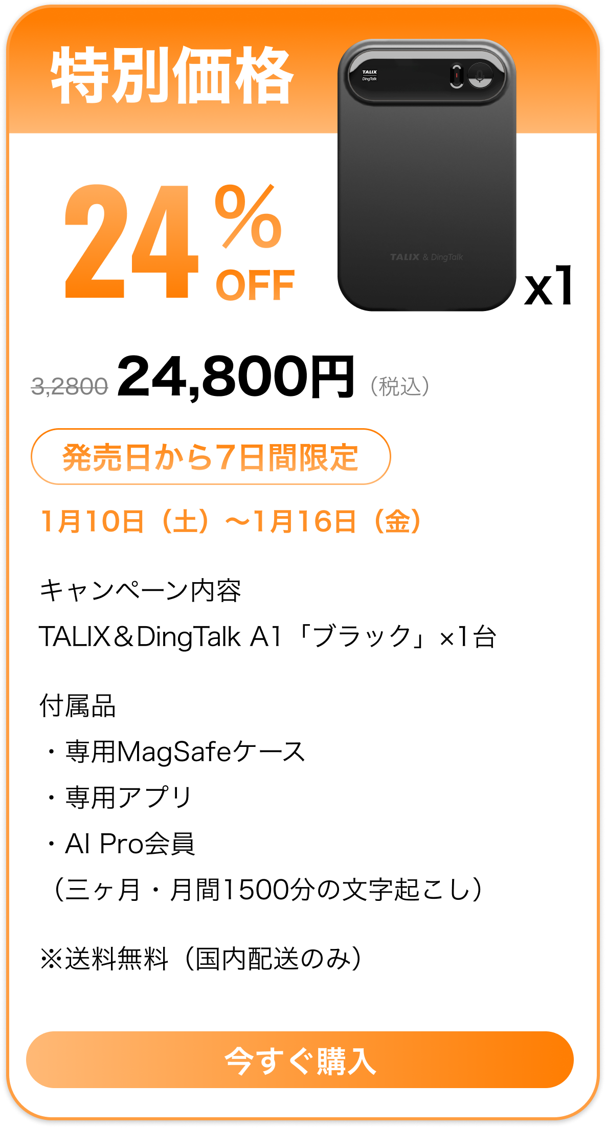 「Pro会員特典」についての説明TALIX & Dingtalk A1 をご購入いただき、1月31日までアクティベーションを完了されたお客様には、Pro会員 3か月分を無料でプレゼントいたします。注意事項● Pro会員特典はアカウントに紐づきます。(端末には紐づきません)● 機種変更、修理、交換等が発生した場合でも、特典は失効しません。● 特典の譲渡・転売・換金はできません。● 2025年1月31日以降にアクティベーションされた場合、本特典は適用対象外となります。● 特典付与の可否は、実際のアクティベーション日時を基準に判断されます。