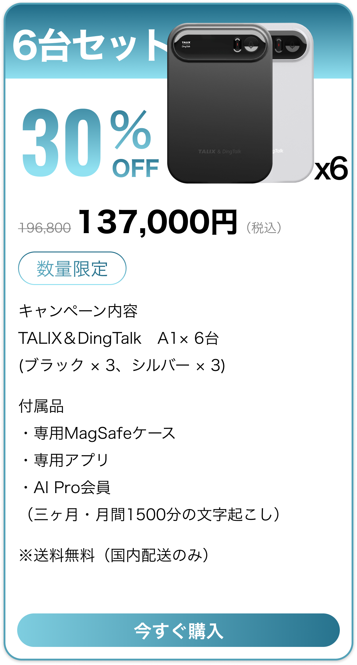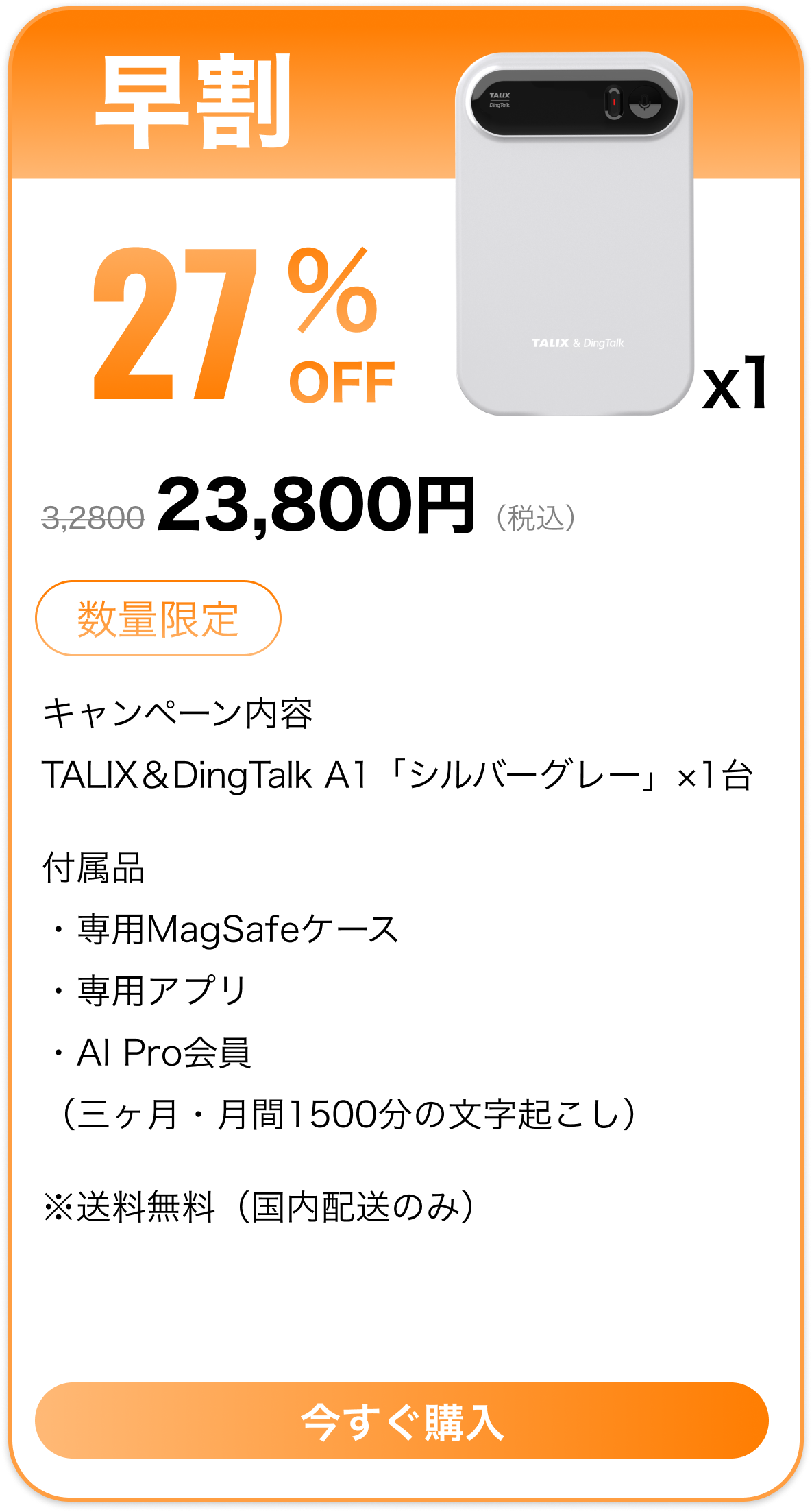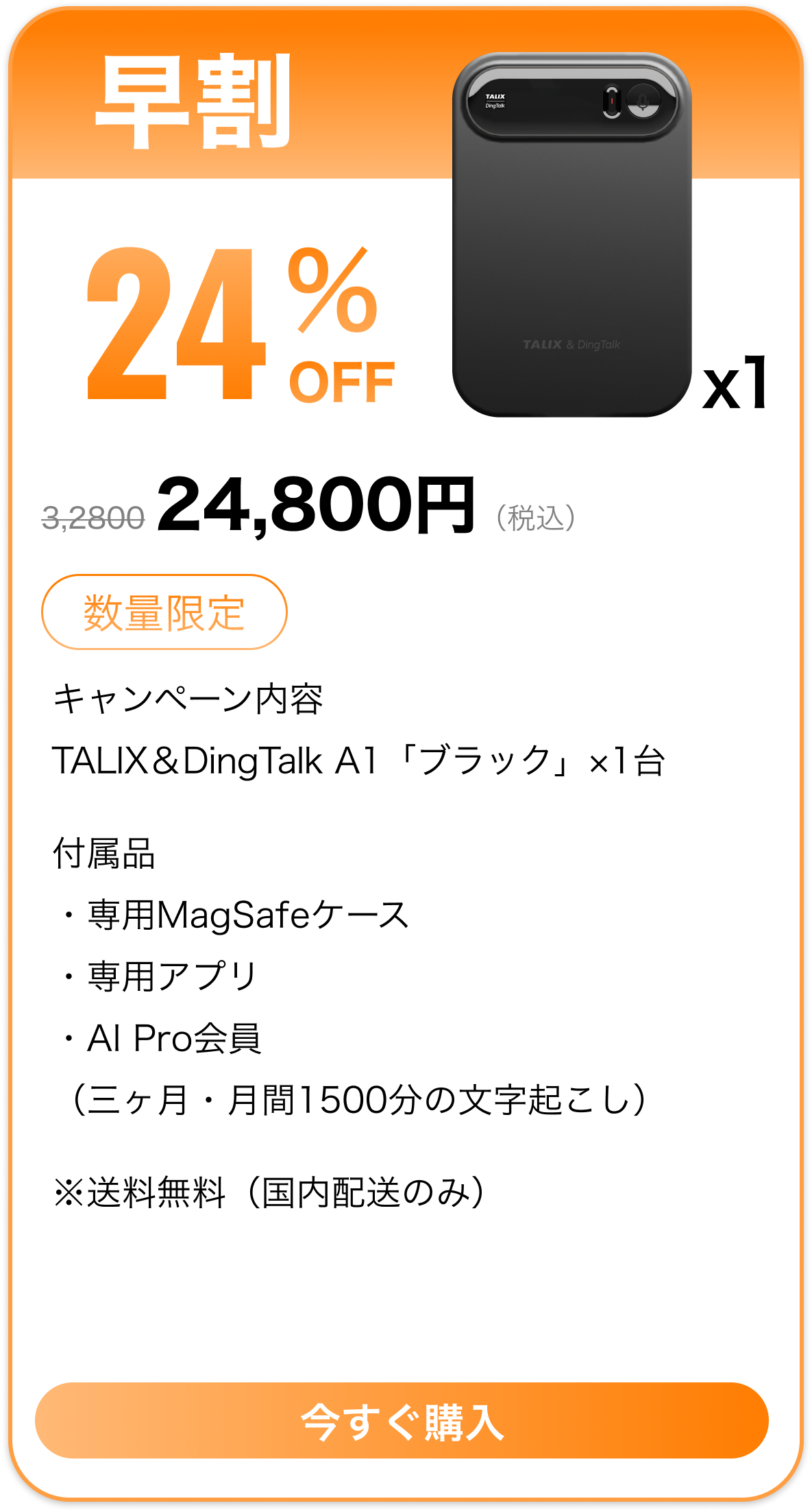 「Pro会員特典」についての説明TALIX & Dingtalk A1 をご購入いただき、1月31日までアクティベーションを完了されたお客様には、Pro会員 3か月分を無料でプレゼントいたします。注意事項● Pro会員特典はアカウントに紐づきます。(端末には紐づきません)● 機種変更、修理、交換等が発生した場合でも、特典は失効しません。● 特典の譲渡・転売・換金はできません。● 2025年1月31日以降にアクティベーションされた場合、本特典は適用対象外となります。● 特典付与の可否は、実際のアクティベーション日時を基準に判断されます。